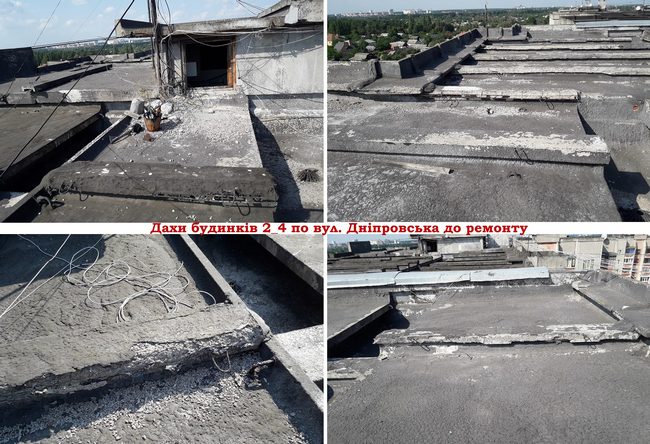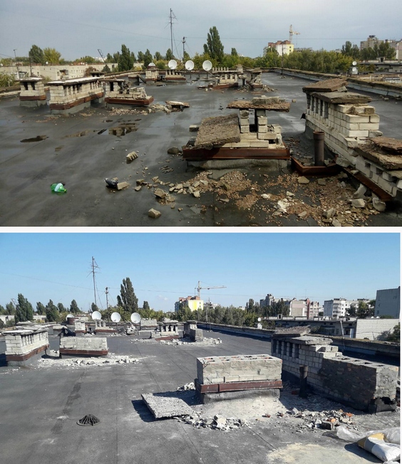 На фото: крыши домов №№ 2,4 по Днепровской до и после ремонта