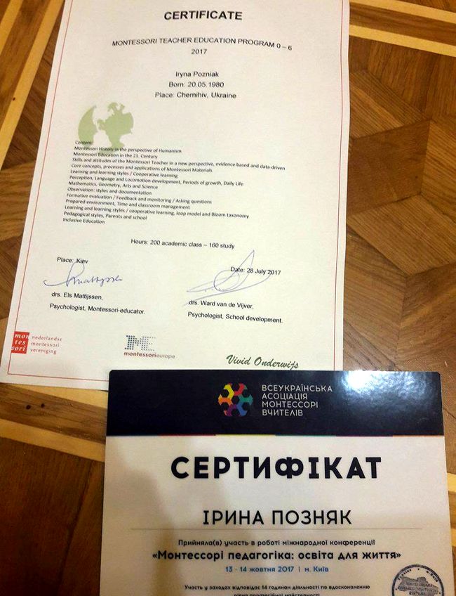 К этой методике я пришла не сразу. Училась в 3 этапа, в общей сложности, 1 год и 3 месяца. Через 4 месяца после учебы в этом году в Киеве состоялась международная конференция, на которой я получила диплом мирового уровня «Монтессорі педагогіка: освіта для життя» от моих учителей из Голландии Варда и Элш. Им по 73 года, они посвятили всю жизнь изучению методики М. Монтессори и теперь обучают людей по всему миру.
