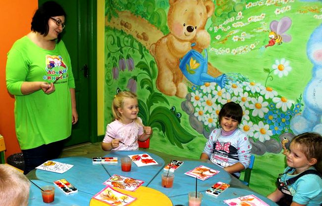 1. Кабинет креативного развития. Здесь проходят творческие занятия самых маленьких вместе с родителями и детей постарше. Детки рисуют разными техниками: карандашами и красками, капустным листом, мочалкой, зубной щеткой, маленькими живыми цветами (хризантемами), ушными палочками; вырезают, делают аппликации из фольги, бумаги, лоскутков ткани, круп; занимаются лепкой из соленого теста, глины, пластилина и др.