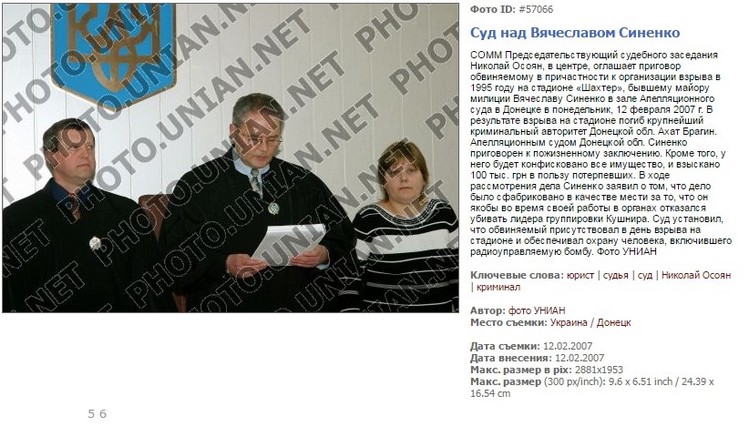 - Судья Николай Осоян, который судил и меня, прославивлся в Донецке и за его пределами тем, что 12 февраля 2007 года Донецкий апелляционный суд, под его председательством приговорил экс-майора МВД Вячеслава Вячеслава Синенко к пожизненному заключению. 4 сентября Верховный суд Украины, рассмотрев кассационную жалобу 59-летнего Вячеслава Васильевича Синенко, отменил приговор суда первой инстанции (апелляционного). 10 декабря 2009-го года Синенко был освобожден из-под стражи в зале суда.