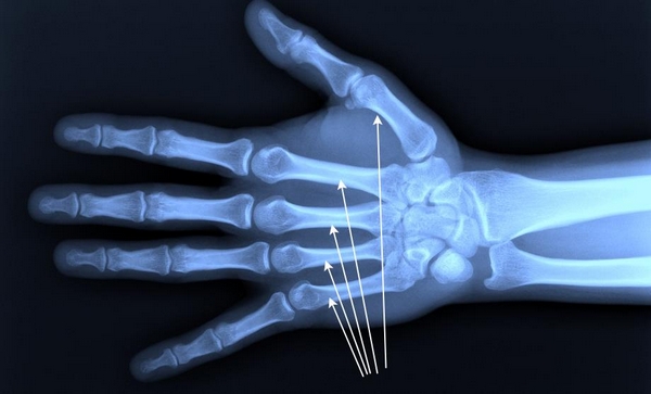 На снимке - строение кисти руки, стрелками указаны пястные кости