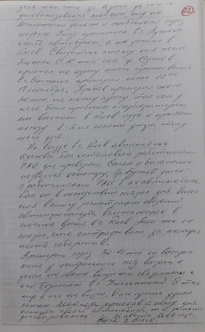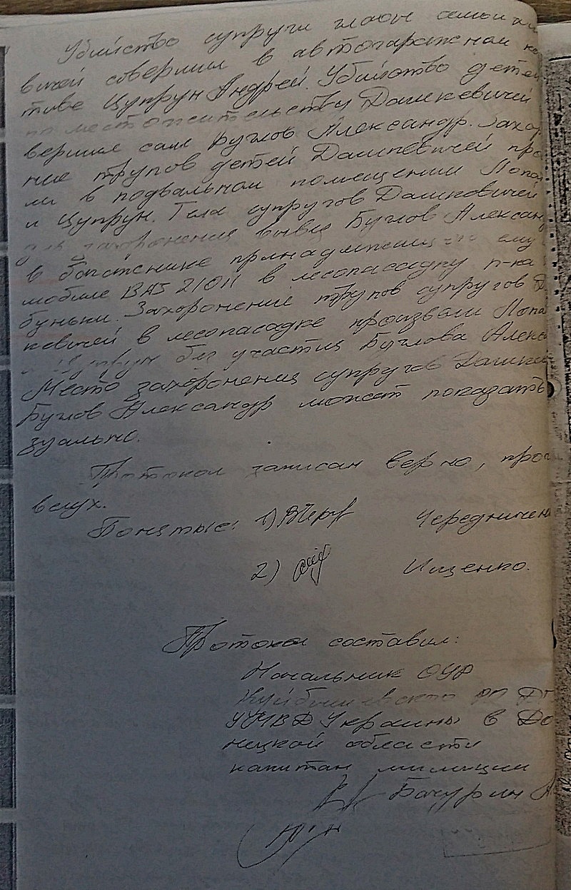 Осенью 1999 года в Куйбышевском районе г.Донецка исчезла семья Дашкевичей. Спустя некоторое время в подвале дома, где она проживала, были обнаружены трупы двоих детей этой семьи. Я совместно с Бугловым А.С. выехал на заработки в г.Северодонецк Луганской области, что собирался сделать еще лотом. Периодически звоня домой по телефону я узнал, что в квартире моего отца и квартире моей мамы были проведены обыски с целью обнаружения улик изобличающих меня в этом преступлении. Естественно ничего обнаружено не было, так как к преступлениям я никакого отношения не имею. При этом я узнал, что меня разыскивают работники милиции по подозрению в совершении этих преступлений.