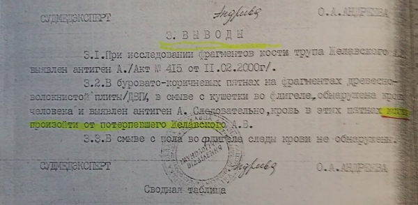 Бурые следы на половице, которая была изъята из вагончика с надписью «Мясо» с дачи Буглова судмедэксперт О.А.Андреева исследовала на принадлежность этого следа либо к крови человека, либо к крови животного. По данным экспертного вывода №422 от 30 августа 2000-го года, - это оказалась кровь человека с антигеном А, также следы данного антигена обнаружили в смыве с кушетки во флигеле дачи. Кость трупа Желавского Андрея, согласно акту №415 от 11.02.2000 значилась носителем антигена А. Поэтому эксперт допустила в своих выводах, что кровь на смыве и на половице могла произойти от потерпевшего Желавского.