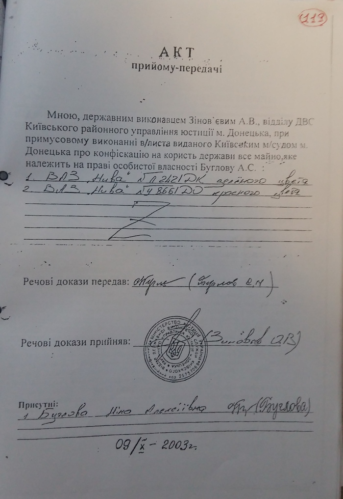 В заключение к сказанному, отметим, что помимо того, что из дела пропали все видеокассеты, оружие, которое должны были хранить хотя бы до поимки Цупруна у Александра Буглова был фактически украден сотрудниками милиции автомобиль ВАЗ 21011 (в деле он фигурирует, как авто, на котором перевозили трупы и нашли банки из под краски в его багажнике). Два других автомобиля марки "Нива" были проданы через ДВС, о чем свидетельствуют материалы дела. Судебные издержки составили 103 грн. 27 копеек, не считая денежной компенсации потерпевшим.