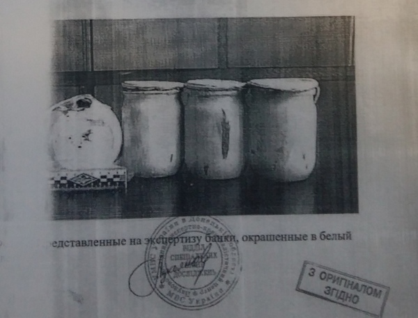 В качестве важных улик по делу на экспертизу в Эксертно-криминалистический центр при УМВД Украины Донецкой области 10.02.2000 поступили помимо оружия 4 банки, вместимостью 0.5 л. (одна битая) и одна банка с краской ПФ-115. По версию следствия именно в этих банках подозреваемые хранили все то оружие, что изображено на фото выше.