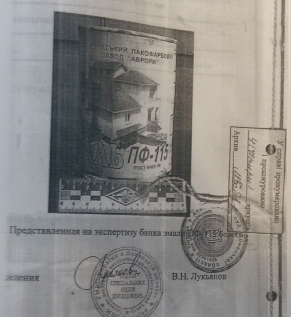 Эксперту подполковнику милиции Лукьянову Владимиру Николаевичу с 14.5-летним стажем работы был поставлен один единственный вопрос от следователя прокуратуры Кирилюка А.В.: "Однородны ли по виду, марке, заводу-изготовителю лакокрасочный материал, которым покрыты наружные поверхности четырех стекляных банок и лакокрасочный материал, находящийся в жестяной банке с надписью "Эмаль ПФ-115"?"