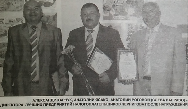 3 сентября в столицу Украины в конференц-холл ГНА съехались руководители более ста наибольших предприятий со всей страны. В этот день председатель государственной налоговой администрации Украины Александр Киреев лично вручил 107 благодарственных грамот лучшим предприятиям-налогоплателыцикам по результатам первого полугодия нынешнего года. Приятно, что среди таких известных предприятий-гигантов, как завод "Криворіжсталь", пивзаводы "Янтарь", "Рогань", ЗАТ ТД "Массандра", "Ужгородский коньячный завод", оказались и черниговские ОАО "Продовольственная компания "Ясен", ЗАО "Дорожно-строительное управление №14", ОАО "Домобудівник" и ОАО "Припуцкий хлебзавод".