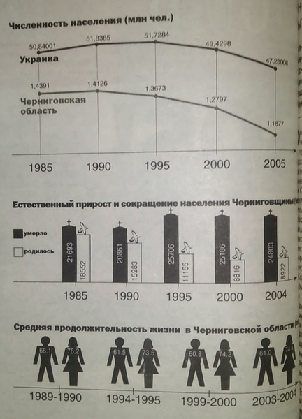 Если в 1985 году, по данным Главного управления статистики в Черниговской области, в нашем регионе насчитывалось 1525 сел, то к сентябрю 2005 года их осталось только 1494. За 20 лет с карты области исчезло более 30 сел! За этот же период население сократилось на 251 тыс. 400 человек - с 1 млн 439 тыс. до 1 млн 187 тыс. человек. Область продолжает лидировать в Украине по темпам сокращения населения.