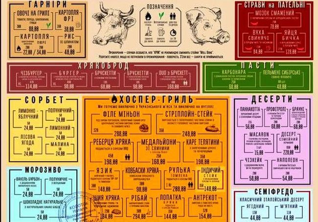 Мінімальне замовлення згідно меню – 350 гривень на 1 персону. Можна приносити свої алкогольні напої, працює послуга CorkFee (50 гривень за 1 відкриту пляшку). Ось маленька частина меню: