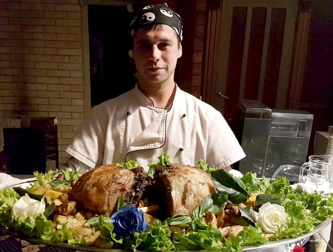 Крім цього, вас очікує блюдо від шеф-кухаря - свиняча лопатка, фарширована грибами та шпинатом. Блюдо виноситься в зал і всі учасники свята можуть взяти собі шматочок, який сподобається.