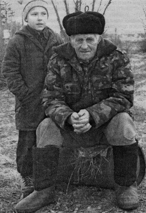 83-річний Василь Грищенко з села Світанок Городнянського району по півдня чекає край дороги, коли їхатиме машина з балонами. Нелегка старість. 45 літ відробив у колгоспі, а тепер, щоб купити хлібину, цукор чи газовий балон, мусить чатувати годинами обіч траси. Бо в селі немає магазину і залишилось 10 жилих хат. Єдина радість - 6-річний правнук Артем.