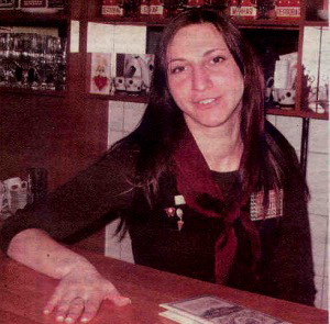 Садимся на «совковый» диван, за совковый стол, вокруг совковые магнитофоны, посуда. На официантке значки, галстук и бейджик — заведующая клубом.