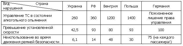 Сравнительная таблица cумм штрафов за некоторые виды нарушения ПДД (в евро)