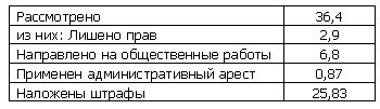 В Киеве, например, штраф накладывается в 95-ти случаях из ста. Для богатого человека или человека с положением в обществе общественные работы были бы куда большим наказанием! Действующая судебная практика в отношении правонарушений, совершенных в состоянии алкогольного опьянения (ст.130 КУпАП) также негативно влияет на эффективность профилактических работ. За два месяца текущего года рассмотрено и принято более 21 тыс. решений, что составляет всего 51% от направленных в суды административных материалов.