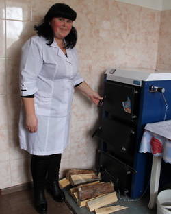 Фельдшерсько-акушерський пункт села Рудьківка на диво зустрів теплом, хоча на трубі подачі газу встановлена така ж сама пломба. Тут два роки тому за грантовою програмою ПРООН встановили альтернативний твердопаливний котел і зробили сучасний ремонт у медзакладі.