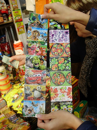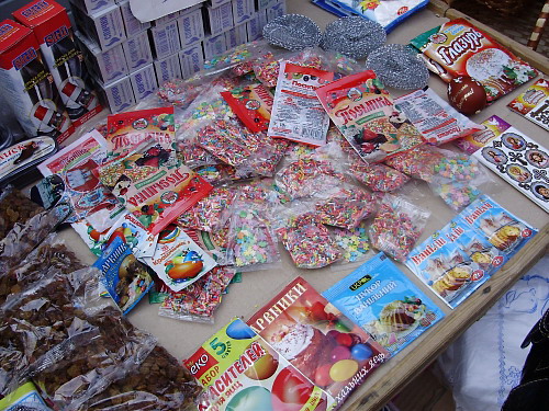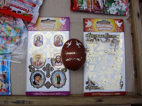 Яркие наклейки на яйца продают как на яичных рядах, так и те продавцы, что торгуют специями, майонезами, соусами и растительным маслом. Очень популярны мультяшные расцветки с персонажами из мультфильмов «Тачки» и «Шрек» (продавцы говорят берут для детей), а также традиционной пасхальной тематики. Есть еще и очень красивые золотистые наклейки в виде надписей по 2,5 грн. Красители для яиц от 1 до 2,5 грн.