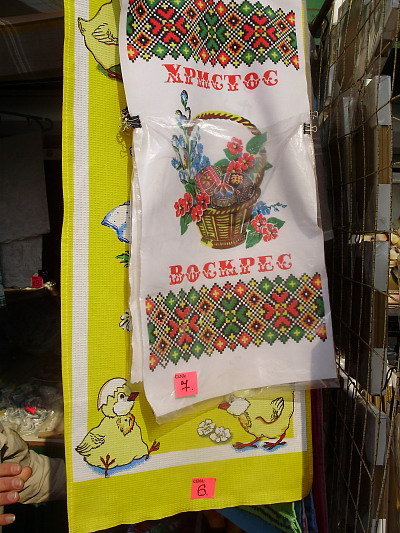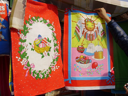 Раскупают на рынки и полотенца, тоже с тематическим рисунком, ведь в корзинке куличи принято накрывать чем-то. Такие по 6-7 гривен.
