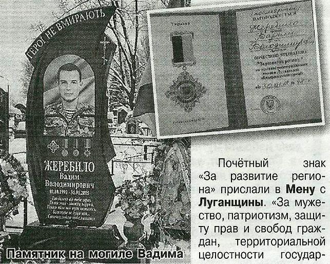 Почётный знак «За развитие региона» прислали в Мену с Луганщины. «За мужество, патриотизм, защиту прав и свобод граждан, территориальной целостности государства, самоотверженное служение Украине» (согласно распоряжению председателя Луганской ОГА, руководителя областной военно-гражданской администрации) этим знаком награждён боец батальона «Айдар» Вадим Жеребило. Посмертно.
