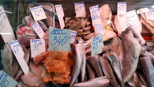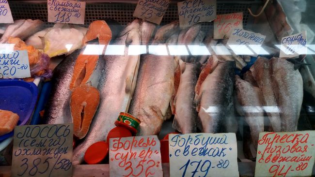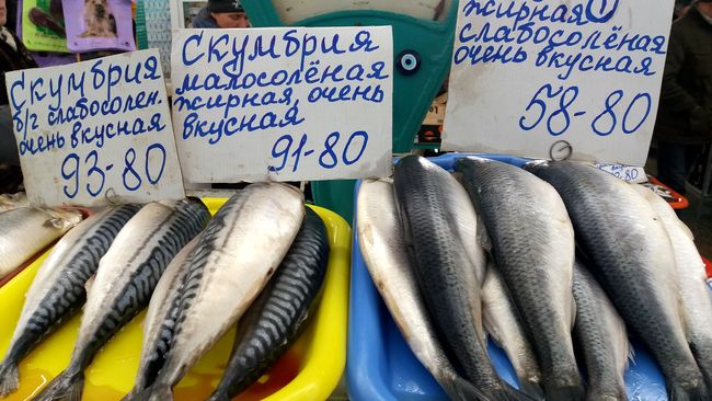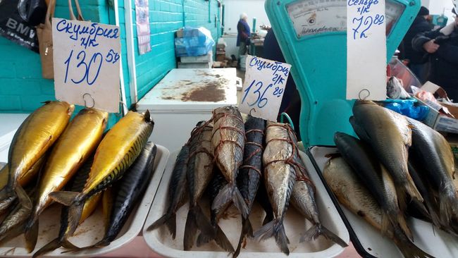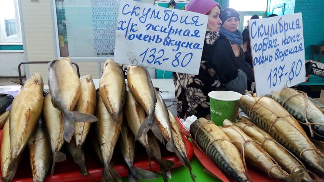 В рыбном павильоне горожане могут выбрать по своему вкусу свежемороженую, охлажденную, соленую или копченую рыбу, а также, баночку лососевой икры или печень трески.