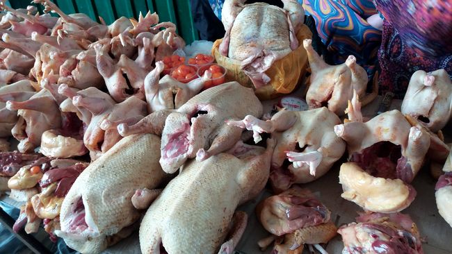 Перед входом жительницы из Менского района продают свежую домашнюю птицу: уточек, курочек, петушков, а также куриные бульонные наборы.