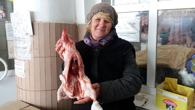 Надежда из Киенки привезла продавать свежих уточек и разделанную тушку нутрии. Рассказала, что в хозяйстве есть всё: козы, куры, петухи, утки и даже муларды (гибрид, получаемый при скрещивании гуся с уткой). Выращивает 15 нутрий. Мясо нутрии похоже по вкусу на что-то среднее между говядиной и свининой. Конечно, есть и огород. Скоро пойдут овощи, фрукты, ягоды. Сельское хозяйство помогает жить: что-то остается для семьи, а что-то - на продажу, чтобы выручить «копеечку».