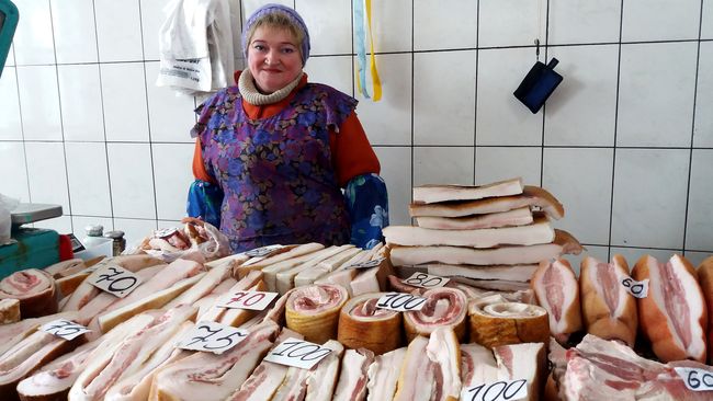 Как обычно, на своем рабочем месте Антонина Гречко. У нее в продаже всегда очень вкусное полтавское соленое сало, которое готовится таким способом. Свежее сало заливают специальным горячим рассолом. Когда рассол остынет — ставят в холодильник на 3-4 дня. Сало готово.