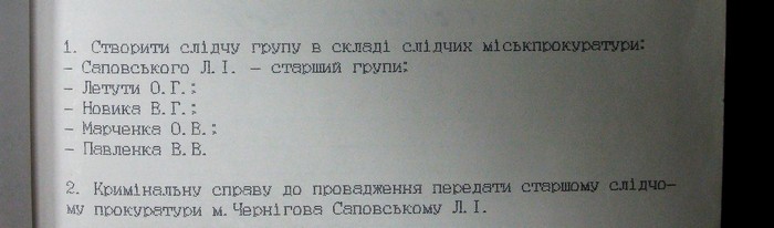 - То убийство, как сейчас помню, было совершено на Михайла. Я тогда работал старшим следователем прокуратуры города Чернигова. Прокурором области был Богатыренко Владимир Константинович, который и дал распоряжение мне расследовать данное дело. Но до конца его я не довел передал то ли Марченко то ли Овчаренко, та как перешел в аппарат прокуратуры области, а это была моя подследственная территория, - вспоминает Леонид Саповский.