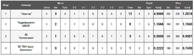 Безусловно, лидером в этом квартете является хмельницкий «Новатор». Он реально претендует на повышение в классе, и по мнению волейбольных специалистов, именно он может составить конкуренцию черниговскому «Педуниверситету».