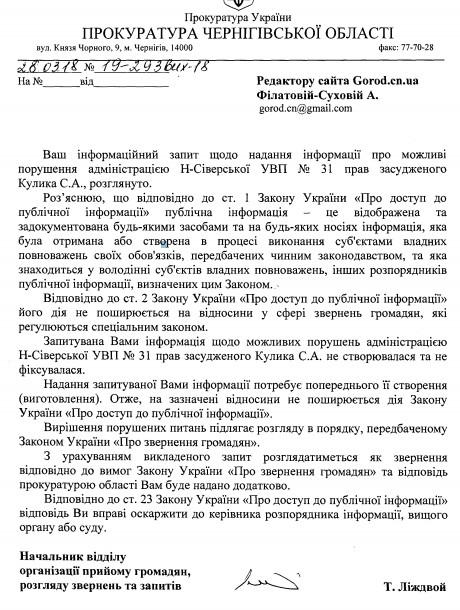 Ниже вы видите пример ответа из прокуратуры по поводу пожизненника Сергея Кулика.