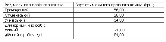 1.3. Вартість місячних проїзних квитків у тролейбусі: