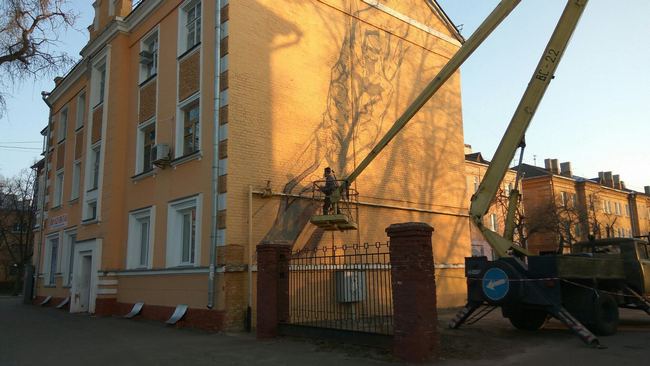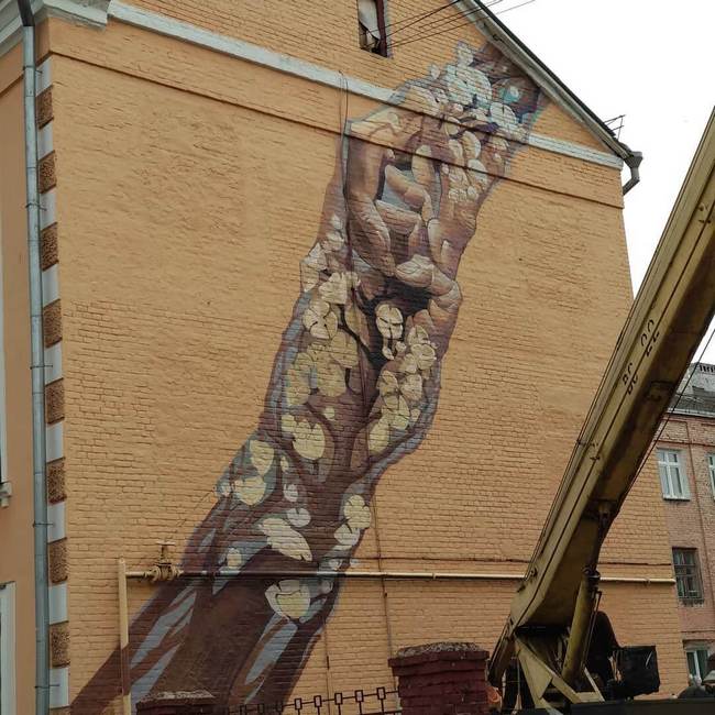 Первые фото будущего мурала стали появляться в сети еще на выходных – 14 апреля. Чуть позже выяснилось, кто автор работы. Им оказался один из известных муралистов Украины – харьковский художник Александр Бритцев, автор работ в Киеве, Каменец-Подольском, Днепре, Донецке и Одессе. В числе его творений – знаменитые муралы в Киеве – “Вороны” и “Сокровищница внутреннего мира человека”, “Пани Днепра” – в Днепре, “Човен-Мрія” – в Одессе.
