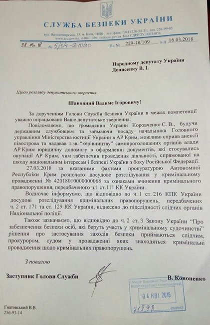 «Сообщаем, что гражданин Украины Коровченко В.С., будучи государственным служащим и занимая должность начальника Главного управления Министерства юстиции Украины в АР Крым, возможно способствовал аннексии полуострова и предоставлял так называемому «руководству» самопровозглашенных органов власти АР Крым юридическую помощь в оформлении документов, касающихся оккупации АР Крым, чем обеспечил проведение деятельности, направленной во вред национальным интересам и безопасности Украины со стороны Российской Федерации», — говорится в ответе СБУ.