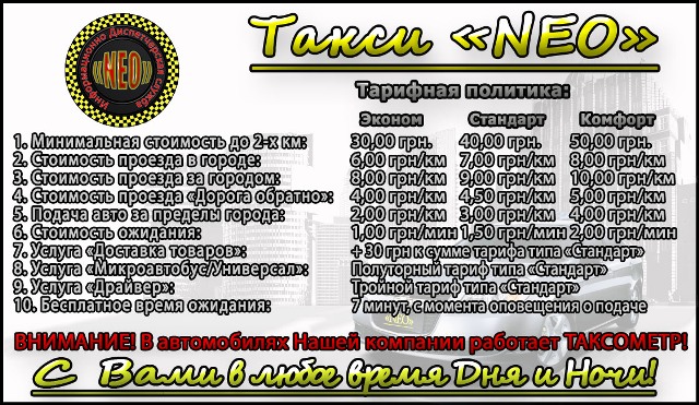 Такси «NEO» круглосуточно находится в полной готовности. Мы только ждем сигнала — Вашего звонка, для того чтобы оперативно доставить Вас в любую точку Чернигова и за его пределы.