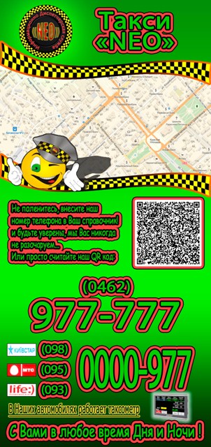 Более детальную информацию об условиях сотрудничества, а также активацию Вашей копии таксометра, Вы можете получить у исполнительного директора такси «NEO», в регионе Чернигов,
