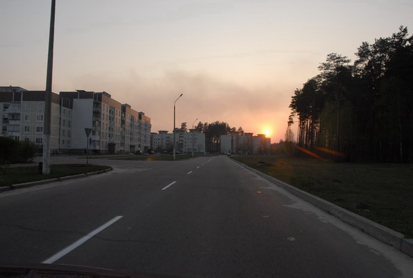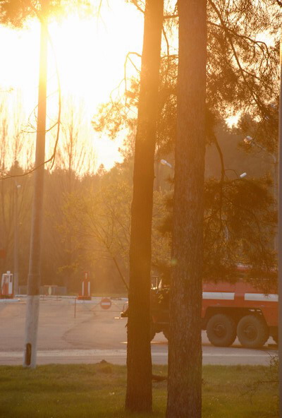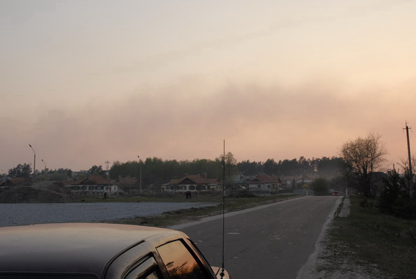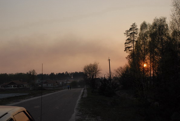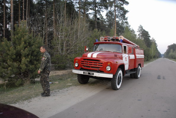 Тревожная новость прилетела к нам в редакцию ближе к вечеру 28 апреля. Где-то в районе Славутича пожар и на помощь направились черниговские МЧСовцы. Естественно редакция не могла остаться в стороне от этих событий. Было принято решение постараться узнать все непосредственно с место событий. Тревожно было на душе. Еще в машине на подъезде к переезду мы почувствовали запах гари, небо со стороны заходящего солнца было закрыто облаками дыма, над трассой висела голубоватая пелена. Но мы почувствовали себя немного спокойнее. Дым поднимался с левой стороны от участка дороги между Славутичем и Пакулем. По прибытию в Славутич возле гидрантов пожарной части № 15 встретили пожарный автомобиль Михайло-Коцюбинсих пожарных, которые прибыли с места пожара и сейчас, после заправки, производили ремонт автомобиля. Пробило одно из колес. Езда по горящему лесу даром не проходит. От них получаем информацию.