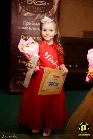 Вот мы и подошли к заключительному аккорду этого яркого и насыщенного эмоциями пятничного вечера. Итак, кто же стал победительницей конкурса «Мини-мисс» от развлекательного центра «Базис»? После подсчета голосов оказалось, что членам жури чуть-чуть больше понравились выступления Вероники Алейник! Поздравляем чудесную талантливую девочку и ее родителей с победой и титулом «Мини-мисс»! Именно Веронике досталась большая диадема (как у настоящей принцессы!) и подарочный сертификат на 1000 гривен. Остальные участницы тоже получили свои титулы и подарки (корону, сладкий «букет» и возможность отметить день рождения в комплексе «Базис»).