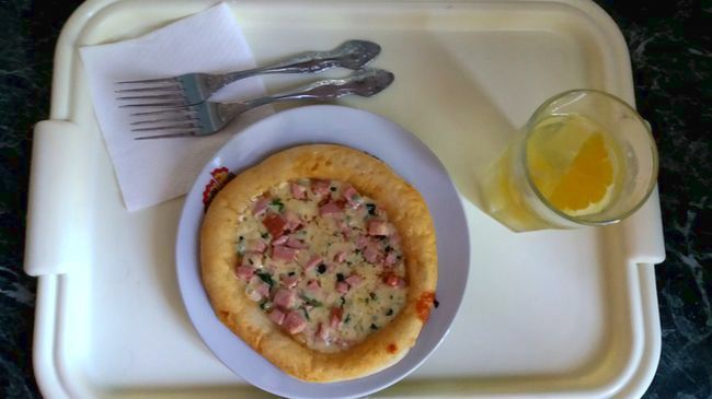 Вариант из пиццы с вареной колбасой (18.00) и апельсиновым напитоком (5.00), обойдется в 23 гривны.