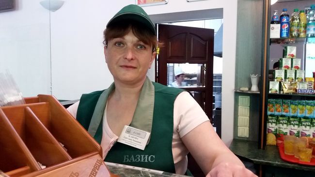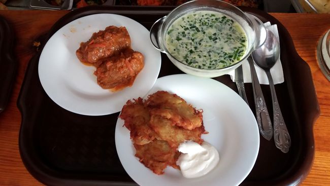 Мы взяли попробовать окрошку (15 грн./350 г), голубцы (19 грн./190 г), деруны со сметаной (12 грн./150 г). Всё вкусно. Особенно, деруны. А прохладная окрошка очень кстати в такую жаркую погоду. Заплатили 46 гривен.