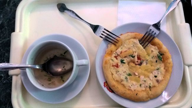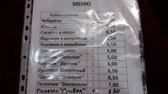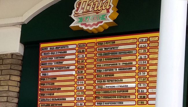 Самая дорогая пицца - с кальмарами, стоит 34 гривны. Самая дешевая – «Маргаритти» за 13.50 гривен. К пицце, как правило, берут либо бульон («Аппетитный» с фрикадельками 15 грн., бульон с пельменями 14 гривен) либо какой-то из напитков. В продаже есть пиво, вода, соки, лимонный и апельсиновый напитки.