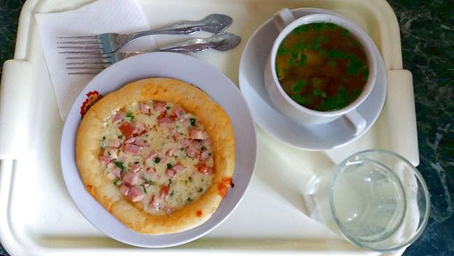 Но можно взять что-то и подешевле. Так, например, суп с фрикадельками (9 грн.), гречка отварная с маслом (9 грн.), куриная котлета на пару (8.40 грн.) и компот из сухофруктов (4 грн.) обойдется в 40 гривен 40 копеек. Но если взять еще кусочек хлеба (1 грн.) и салат из свежей капусты (16 грн.), то получится уже 57.40. Не каждому, скажем, по карману.