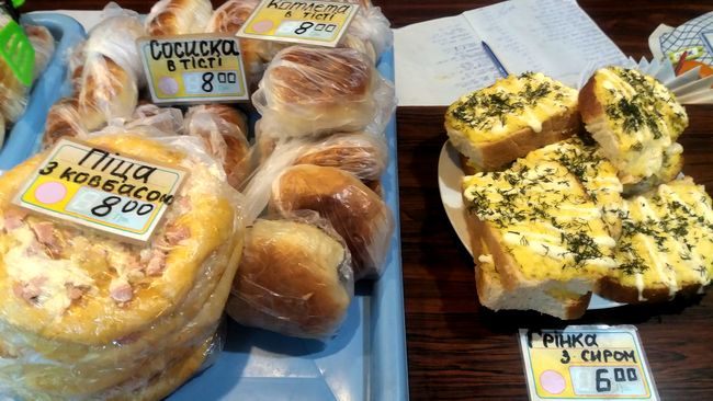 Сосиска и котлета в тесте, пицца с колбасой за 8 гривен, гренки с сыром за 6 гривен. При желании выпечку можно разогреть в микроволновке.