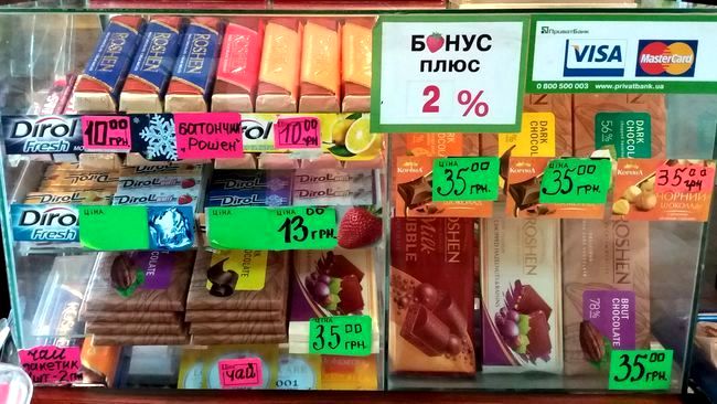 В продаже есть спиртные напитки, шоколад, жевательные резинки с наценками.