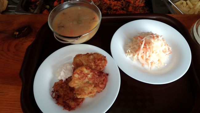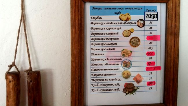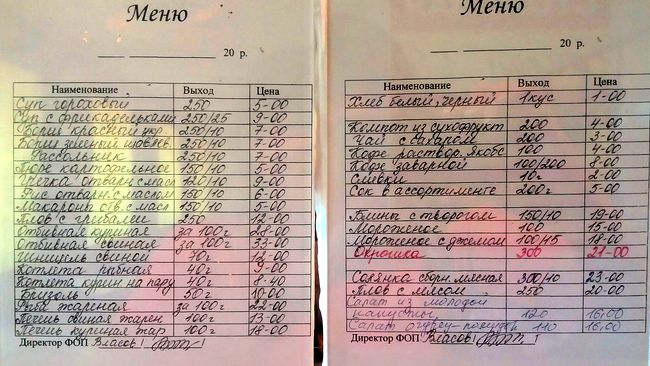 Это могут быть сырники и чай за 19 гривен, вареники с картошкой и грибной суп с хлебом за 25 гривен, или просто суп и пирог закусочный (пицца) за 24 гривны. А может быть полноценный обед из 3-х блюд от 30 гривен и выше.