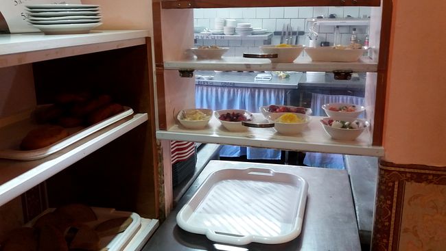 3. Салаты и вторые блюда накладывают в белоснежные тарелки, первые – в стеклянные супницы, что выглядит эстетично и аппетитно. Салфетки и столовые приборы аккуратно сложены и находятся рядом с кассой. Рассчитавшись, остается только их положить на поднос. Это удобно.