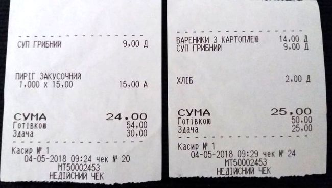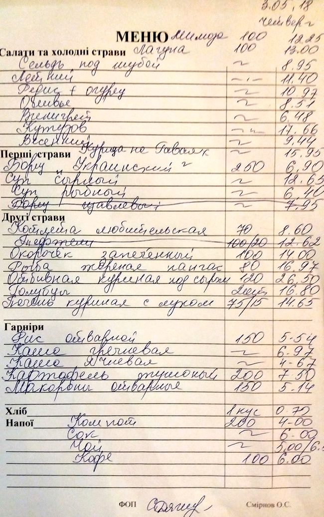 Обед, состоящий из супа грибного (9 грн.), дерунов со сметаной (12 грн.) и салата из капусты (6 грн.) обошелся одному из посетителей в 27 гривен.