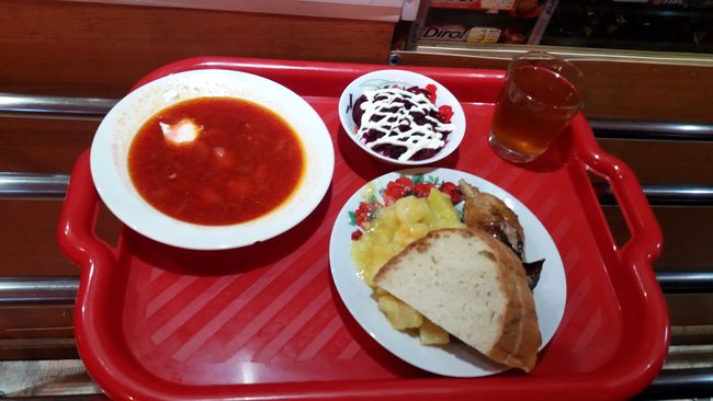 Борщ украинский (6.90), картофель тушеный (7.50), окорочок (14 грн./100 г), сельдь под шубой (8.95), 2 кусочка хлеба (1.40) и компот (4.00). Цена такого обеда 57 гривен.