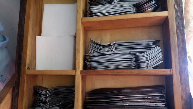 Если и есть очередь, как правило, в обеденное время, то продвигается она всегда очень быстро. Один кассир-контролер принимает заказы и передает их на кухню поварам, а второй – рассчитывает посетителей на кассе. 5 минут – и ваш заказ готов. Кстати, традиция есть пиццу двумя вилками вместо одной вилки и ножа, соблюдается по сей день.