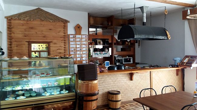Зал рассчитан на 40 посадочных мест. Интерьер столовой выполнен в национальном украинском стиле. Здесь и декоративный плетень с горшками и рушниками, и стилизованная украинская печка, деревянные бочки и кадки. На стене – телевизор с программой о вкусной еде.