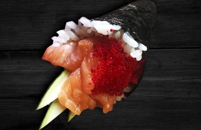Хенд ролл с лососем (огурец, латук, японский майонез, тобико, лосось, рис, нори)