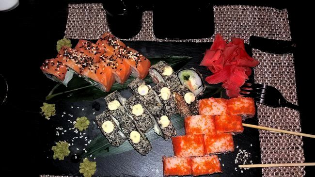 Красиво выложенные роллы с вассаби в виде розочек и маринованным имбирем, подали на специальной тарелке из черного сланца. В отдельном соуснике - соевый соус. Ну, и обязательно, специальные палочки. Для тех, кто еще не научился ими пользоваться, Ирина предложит так называемые, ученические.